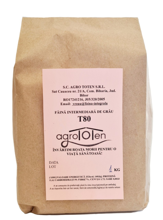 Făina intermediară de grâu T80 Agro Toten este sănătoasă și naturală. Tehnologia este cea a măcinării bobului întreg, în mod tradițional pe piatră. Apoi, făina integrală este cernută obținând făina intermediară T80, grișul integral de grâu și tărâțele.